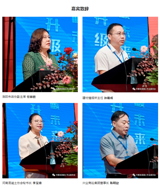 洛陽市政協(xié)副主席任麗君、建筑材料工業(yè)技術(shù)情報研究所孫繼成主任、河南省建筑業(yè)協(xié)會混凝土分會秘書長李寶琦、興業(yè)商砼集團董事長陳明欣分別為本次大會致辭。